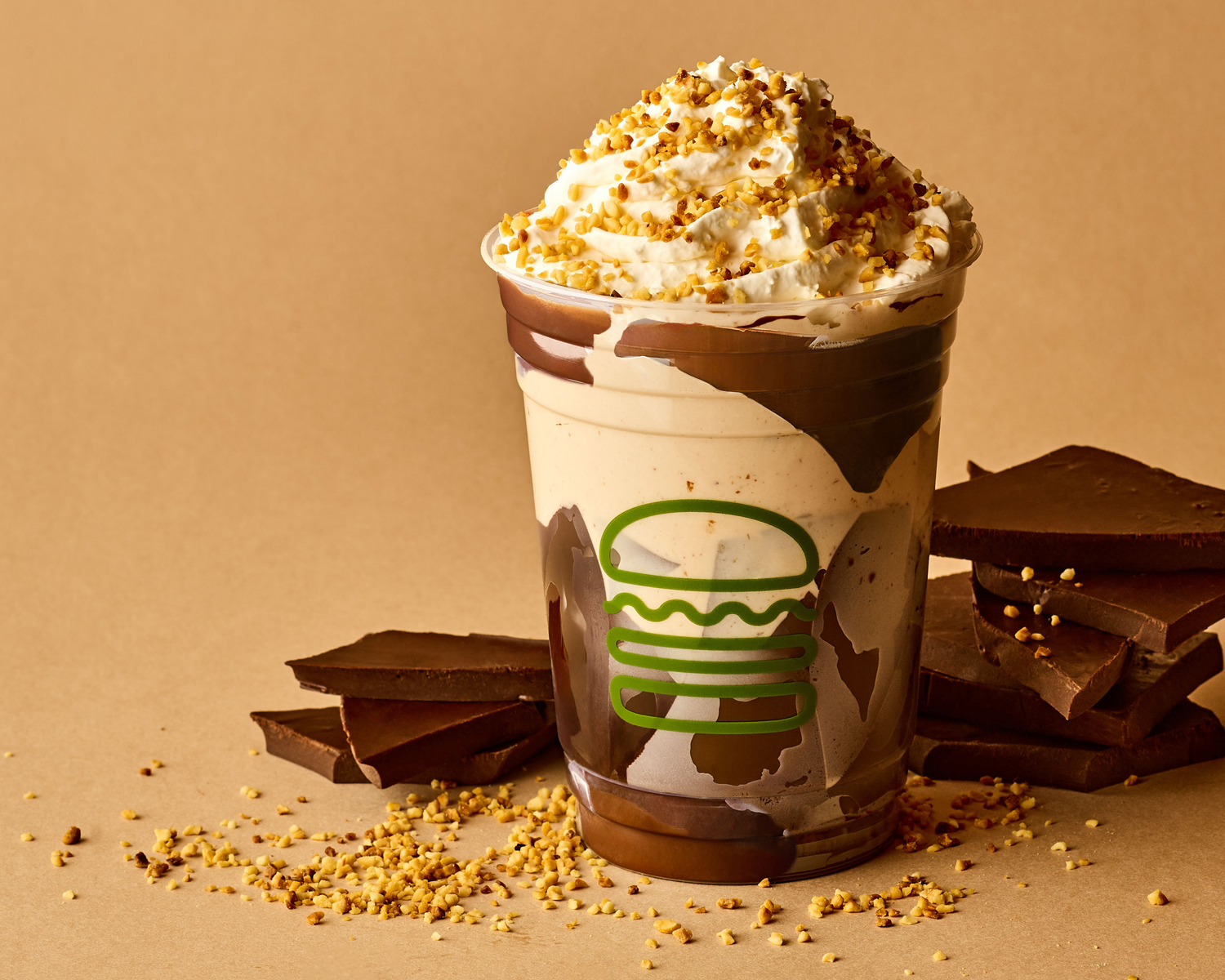 バニラカスタードにヘーゼルナッツチョコレートペーストとミルクをブレンドした濃厚なシェイクを、パリッと割れるチョコレートカップに注いだ期間限定シェイク。